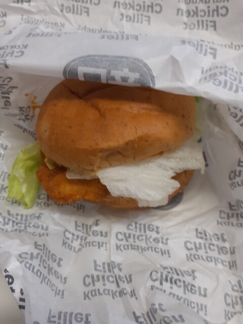 オーロラソース的な印象を抱いたソース。で、間に挟まっているのは、毎度お馴染みケンタのチキン。衣がカラッとしていて、バンズがふっくら。ソースの味がチキンとマッチしていて、チキンも安定の美味しさだし、良かった。