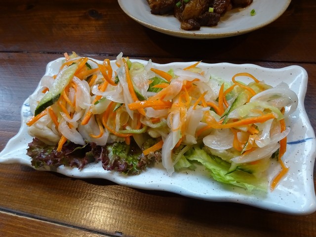 お通しにはきのこの和え物がちょっと付いてきましたが、もちろんそれだけでは足りないので酒に合わせて肴を注文。
