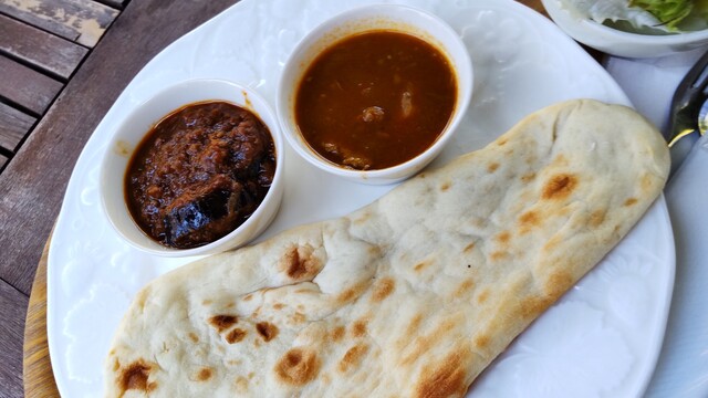 天気の良い土曜日の2人ランチ。私はカレー2種とナンの【ナンセット】1240円とセットドリンクの【レモン&ジンジャーティー】370円を、連れは白身魚のフライ、かぼちゃとベーコンのグラタン、野菜サラダ、ニンジンサブジ、ご飯、煮物、味噌汁の付いた【ラグラスランチ】1240円にセット割引の【森のコーヒー】370円を注文しました。