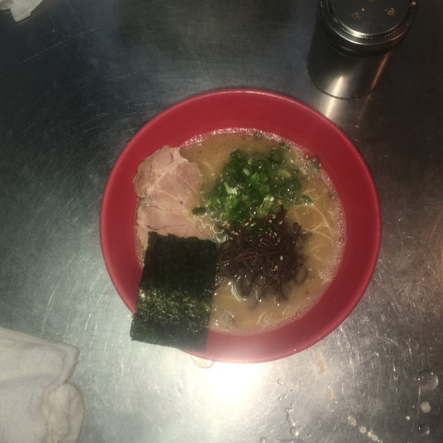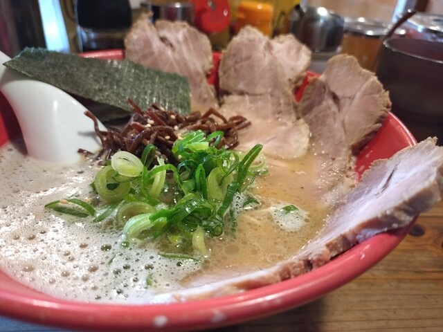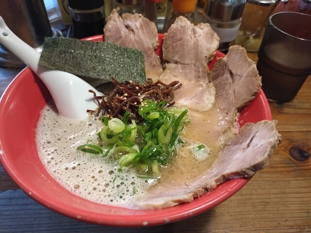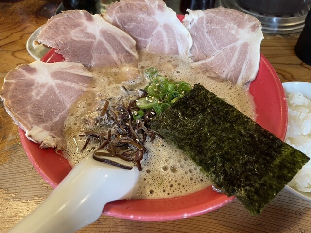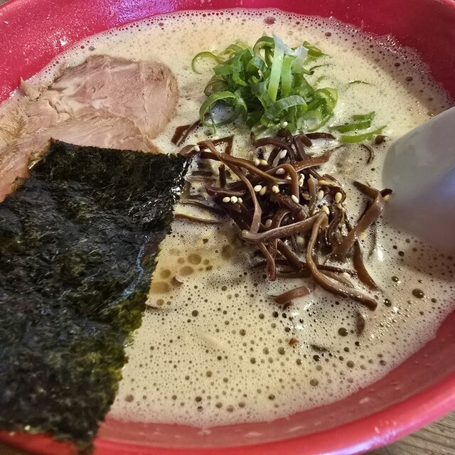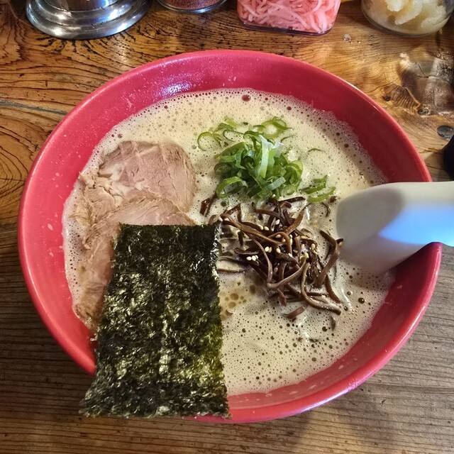 ラーメン(粉おとし)+からし高菜+替玉(粉落とし) 雨中の通院後、ラーメンを食べたく比較的近場で安定した旨みを楽しめるこちらに決定。何故かここを訪れる時は雨が多い。 平日午後1時頃、店斜め向かいの広い無料専用駐車場に停め、お店に向かうと雨でも5人の並び。12席程の店内は満員。 換気扇か... 詳細を見る