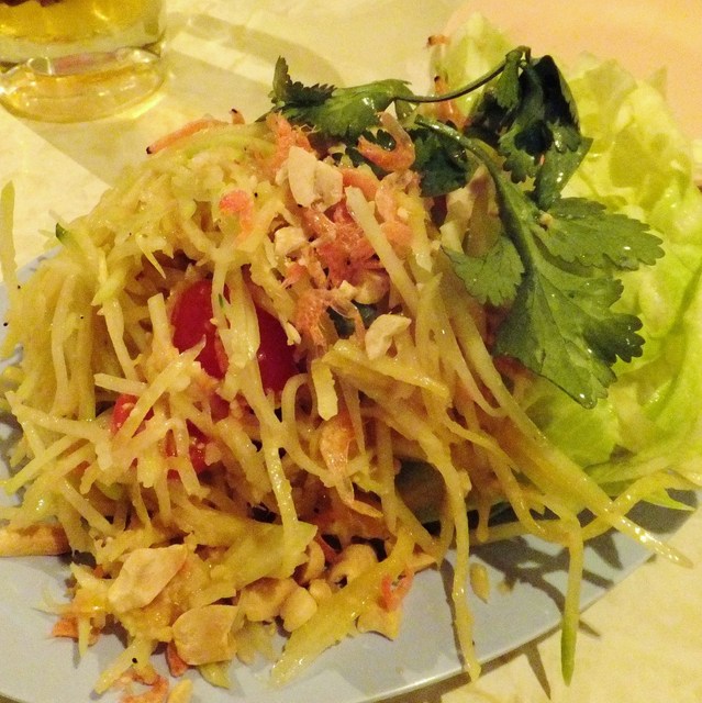 日曜日の正午におじゃましました 店内8割方の入り ファーストコンタクトはハッピーアワーのメコンソーダとソムタムの1辛 前回、2辛でギリギリだったので美味しく食べられる1辛でオーダー オーダーが混雑していて提供まで10分待ち そもそも昼飲みでやる気マンマンなので時間は気になりません笑 客の回転がいいので長期戦OK ガイトードとメコンソーダを追加オーダー ...