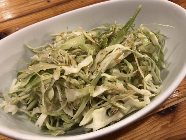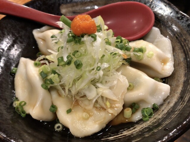 お通し(300円)はキャベツの千切り。生ビールを頼んで、焼餃子のりんや(3コ:330円)、海老しそ(3コ:360円)を頼み、かわりだね餃子の水餃子(ゴマダレorネギポンとあったのでゴマダレで)(5コ:50...