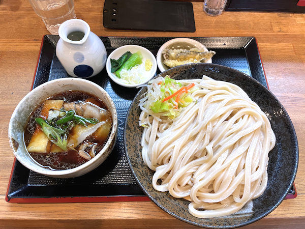 本日は、肉うどんのつけ汁(1000円➕大盛り1.5玉150円)に大きな舞茸天(450円)の布陣だ。
