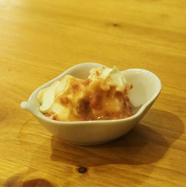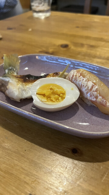 お通しは「お寿司(真鯛)、味玉、ひよこ豆のフムス」