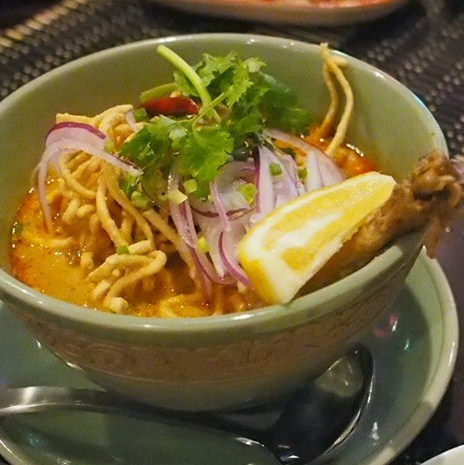(タイ東北部チェンマイのカレーラーメン)と生春巻き、ミニガッパオライス、ドリンク、ミニデザートがついて¥980