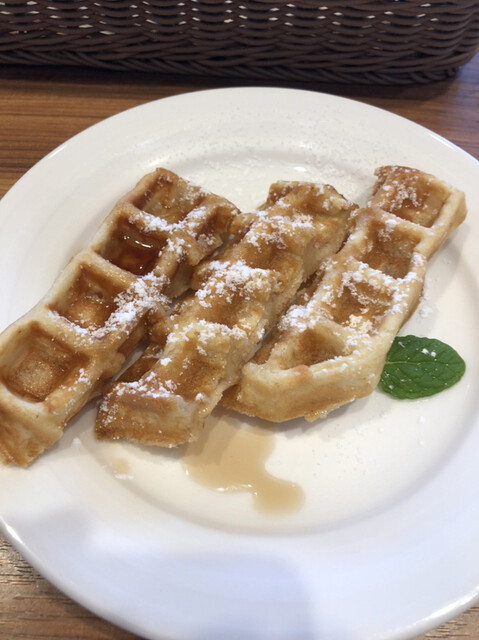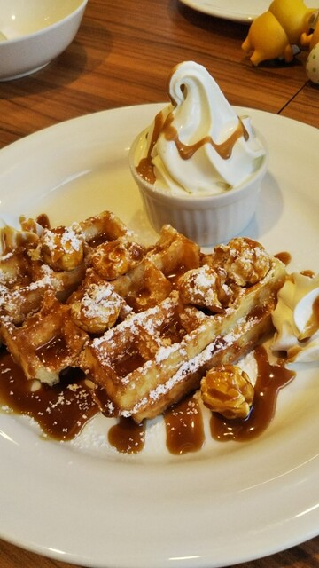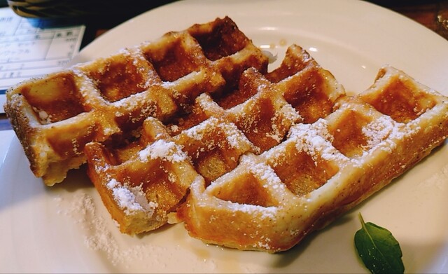 ワッフルは注文が入ってから焼き上げ、外パリッとで中はふんわり、ハチミツが沁みた部分がしっとりといろんな食感を楽しめます◎程...