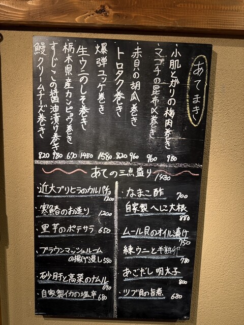 予約して行きましたがほぼ満席で賑わっています。あて巻きと日本酒というコンセプトが受けていると思います。日本酒が種類豊富で料理も美味。カウンター席も心地良く楽しめます。うなぎクリームチーズ、すじこの醤油...