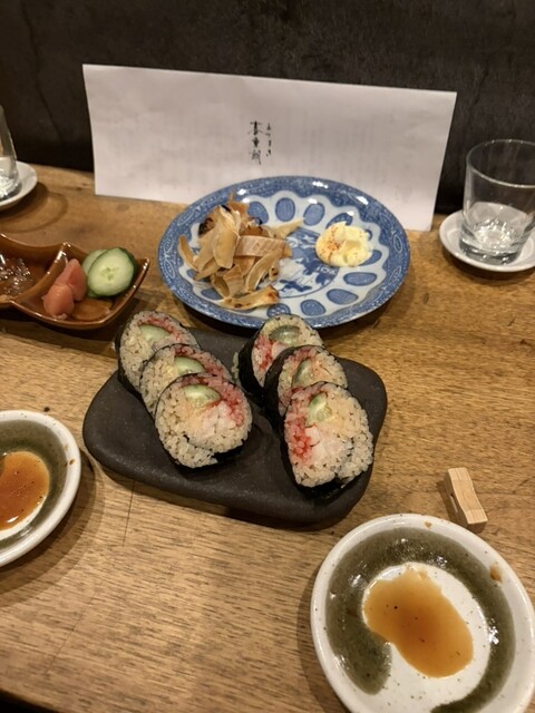 あてまき喜重朗に訪問。寿司の“巻き”をつまみとして楽しむ「あて巻き」がコンセプトの店で、カウンター中心のカジュアルな雰囲気。駅からも比較的アクセスしやすく、サクッと飲みに使いやすい立地です。