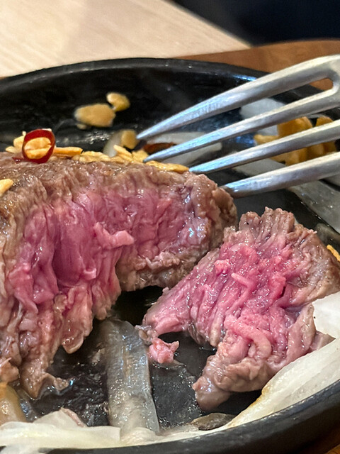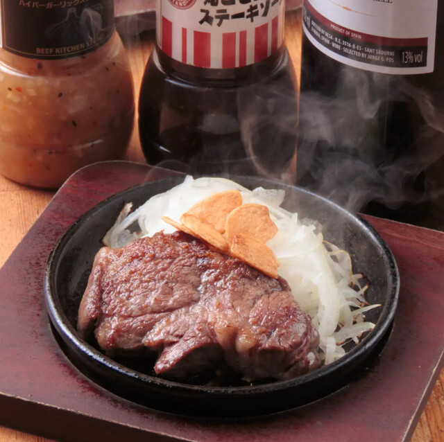 ▶︎ 熱々の鉄板で提供される名物メニュー。柔らかく焼き上げられたビフテキは...