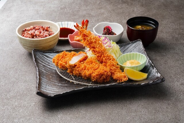 大きな海老フライが2本、一口ヒレカツ1枚に梅シソ巻揚げが1...