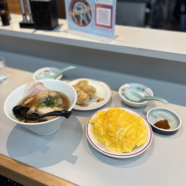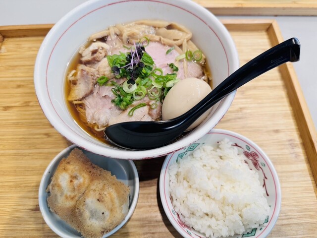 立川の〈東京ギョーザスタンド ウーロン GREEN SPRINGS店〉で「全盛り(中華そば餃子定食)」をいただいた。