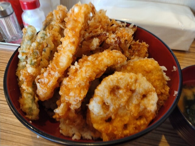 チキ玉丼 650円 鶏胸肉、さつまいも、アスパラ、揚げ玉子 味噌汁おかわり100円は高い。味噌汁だけクオリティー低い。 ------------------------------------ ◎満足 ◯普通 △残念 ◎味 衣があつく見えるが意外とサクサクしていて重くない。アス... 詳細を見る