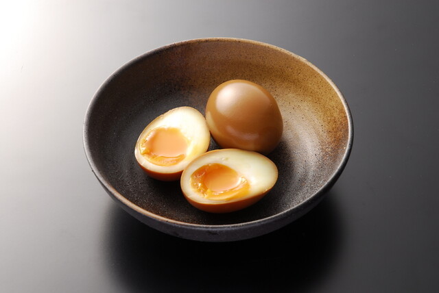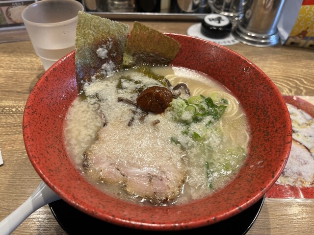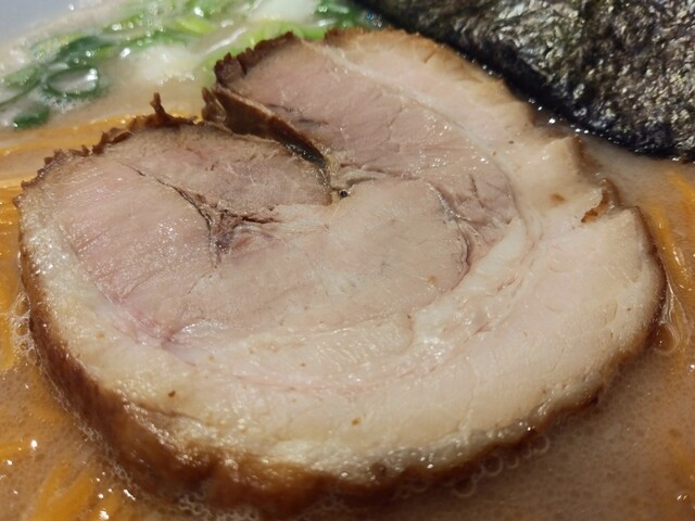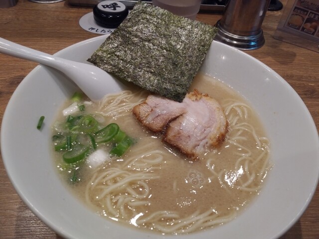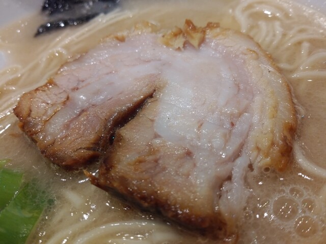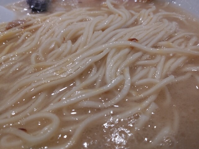 大量の豚骨を十三時間徹底的に煮込んだ旨味凝縮スープは、とてもクリーミーで臭みもなく、豚骨の旨味を最大限に引き出している。低加水麺独特の歯ごたえのある自家製細麺が濃厚豚骨スープと絶妙に絡み合う。