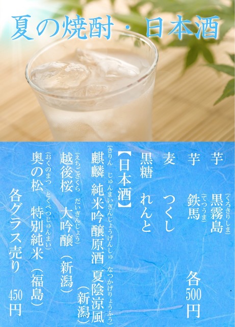 | ドリンク | 日本酒あり、焼酎あり、ワインあり、カクテルあり、日本酒にこだわる、焼酎にこだわる |