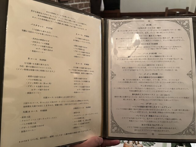 Cコースを予約。前菜、パスタ、肉料理、デザート...