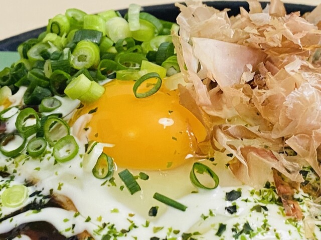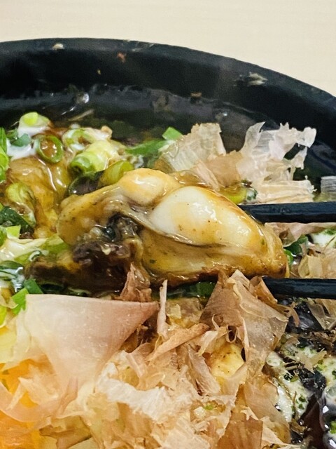 カキオコは真ん中に生玉子が乗り、花鰹、小葱がたっぷりで見た目にインパク...