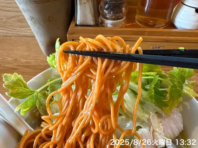 初めて辛麺に唐辛子の練り込み麺にしました。