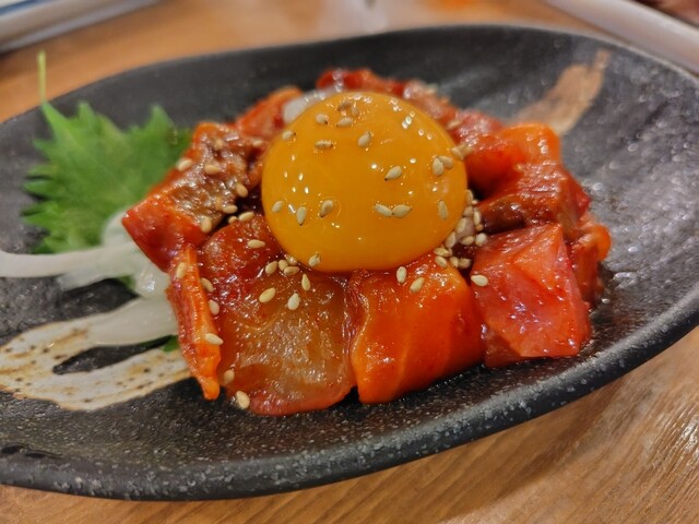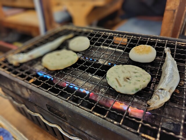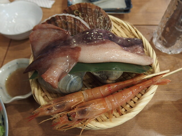 12:20頃の到着でそこそこの空き、一人用の席に通されまずは、とりビ、次にきゅうりの漬物とメインの浜焼きを注文、かなりでかいホンビノス貝と帆立、エビが2個づつ、それとイカ、ホンビノスも帆立もまずまずの新鮮さ、焼いたイカを七味、マヨ、醤油でいただくのは、やはり美味し!イカは厚みもあり結構なボリューム、最後に食べた焼きおにぎりに...
