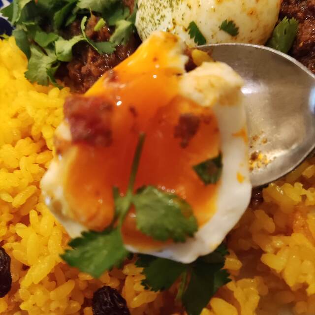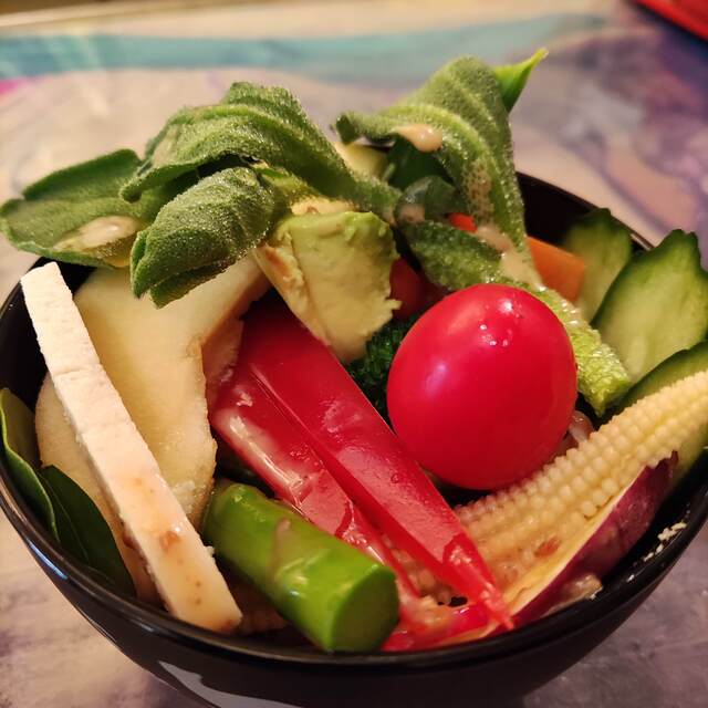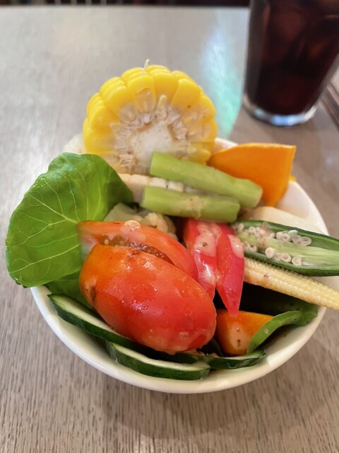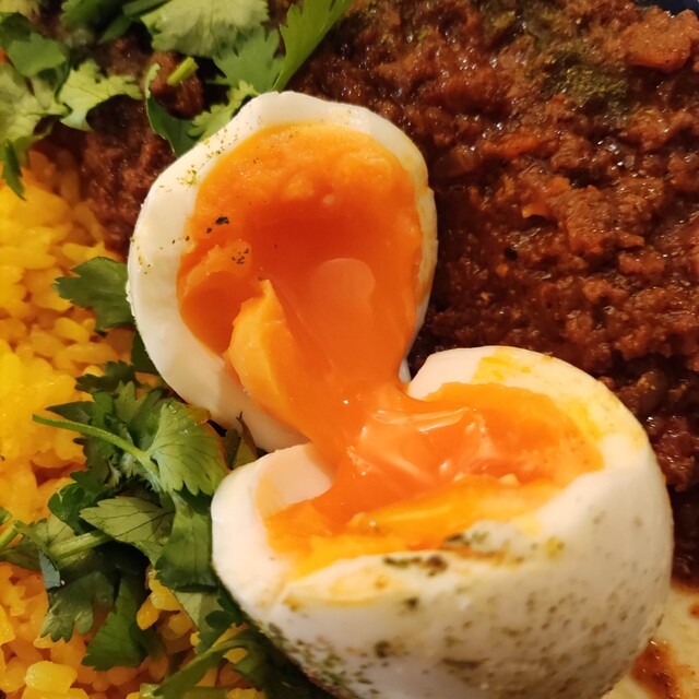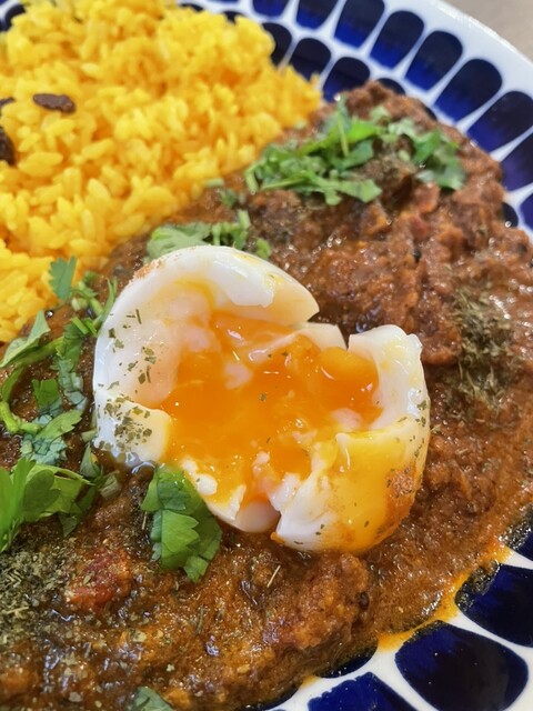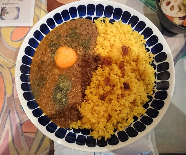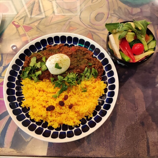 お願いしたのは未食のキーママトンカレーとホットコーヒーです。オーダー後にお気に入りのギュッと美味しさ詰まったサラダボウルの盛り付けが始まります。程なく10種類以上の野菜が使われ自家製ドレッシングのかかったサラダが提供されまし...