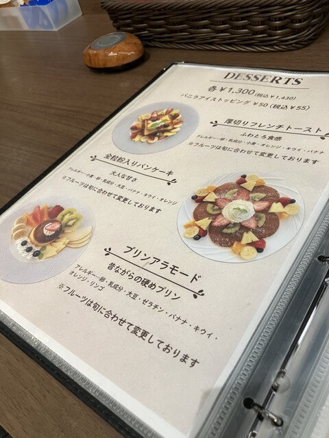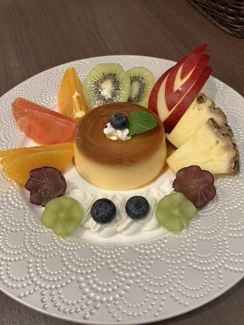 2025.11【再訪】JR八王子駅南口に隣接する商業施設”OPA”2階入口前にあるお店。平日の夕方利用。しばらくぶりの利用ですが、メニューが大幅に変更。フード系はピザのみとなり、フルーツ盛合せも削除。去年に食べた桃パフェは、丸ごとのった桃が美味しくて感動ものだったのに…今回は季節感のあるフルーツは全くなし。仕方なく、それなりにフルーツが盛られているプリンアラモード(フルーツは日替わり)1,430円を注文!