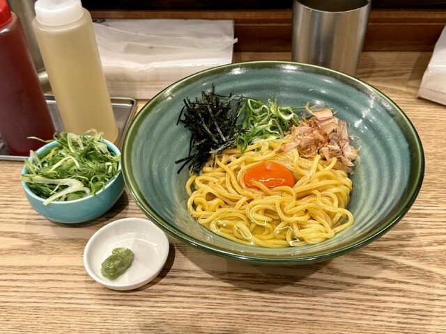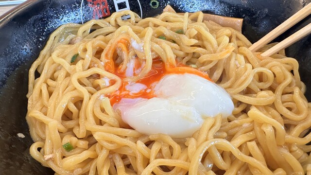 麺は中太でもちもちとした食感で、タレとの絡みが非常に良い。丼の底からしっかり混ぜ...