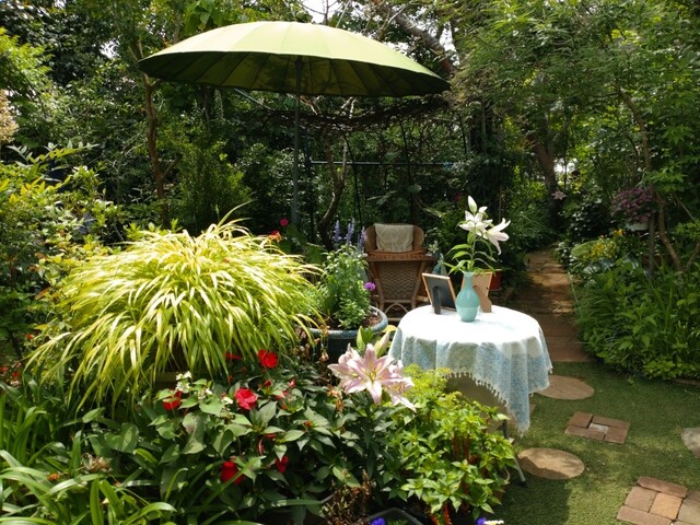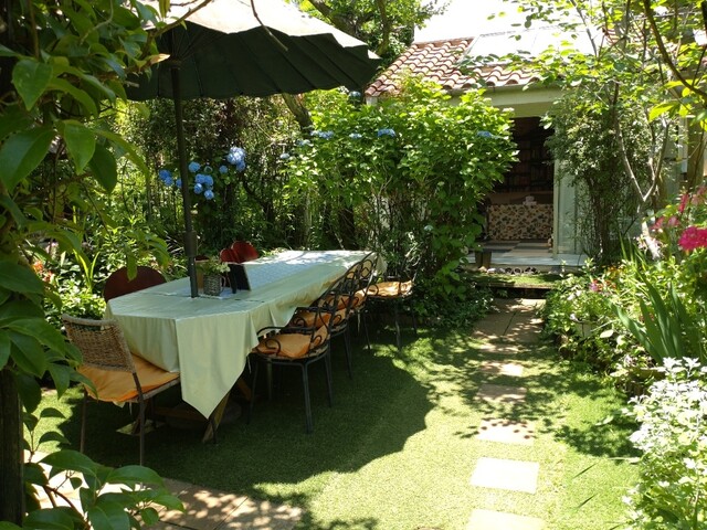 グリーンやお花が溢れるお庭には、テーブルとパラソルが点在しています。