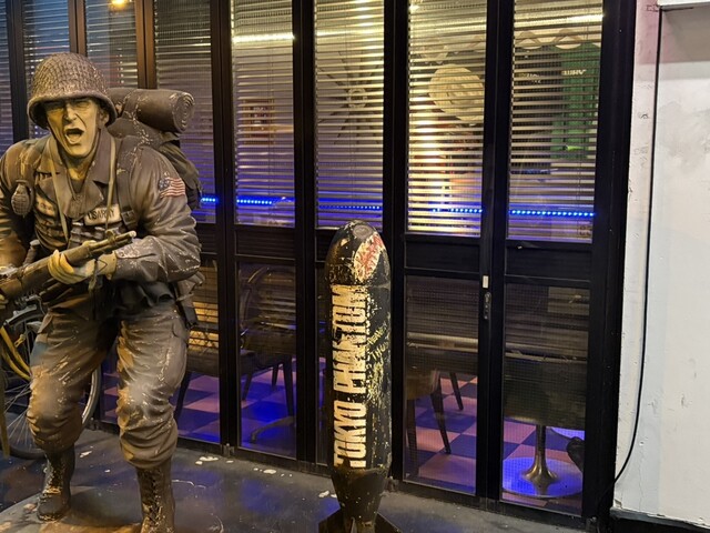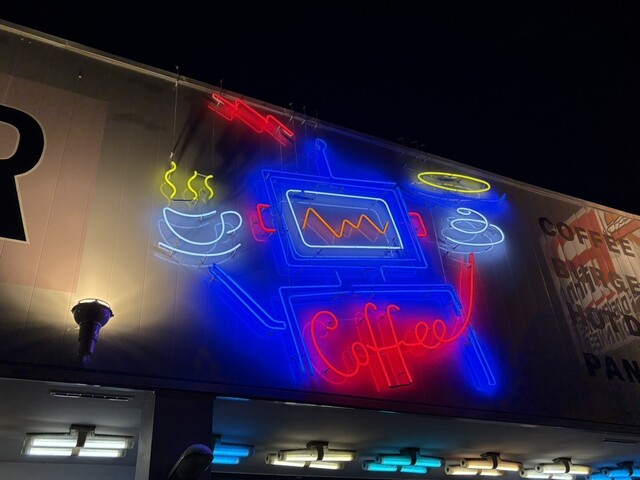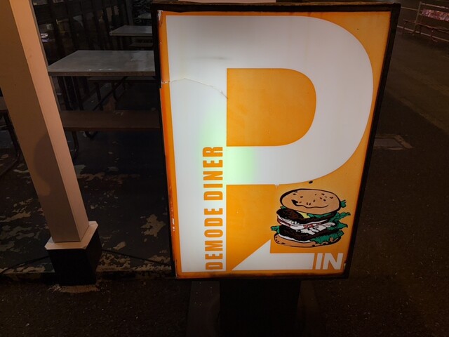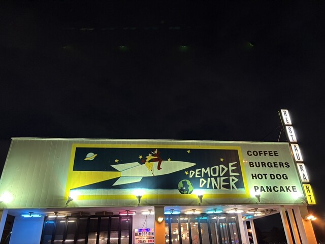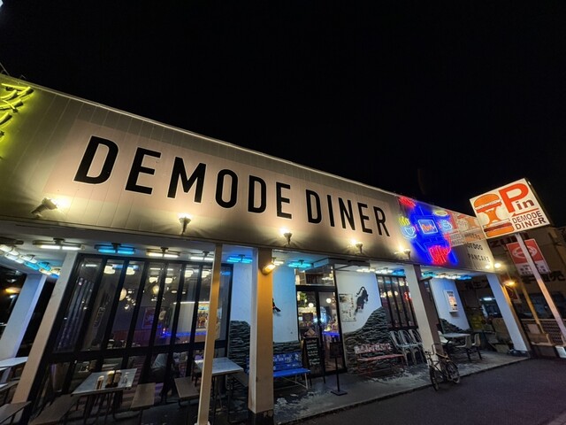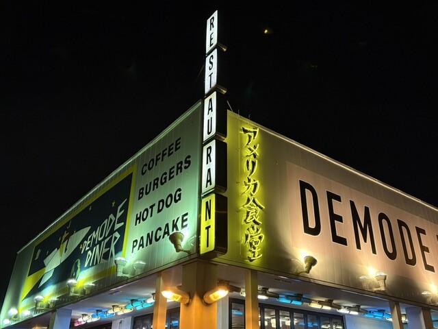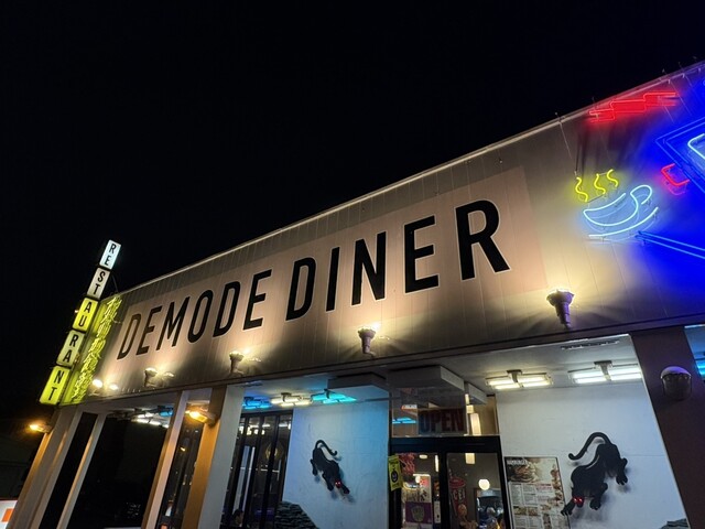 デモデダイナーは名物タワーバーガーをはじめ、7種のスパイスを効かせたオリジナルハンバーガーが人気のアメリカンダイナー。米軍横田基地の前を走る国道16号沿いにあり、ロボットのネオンが目印です。