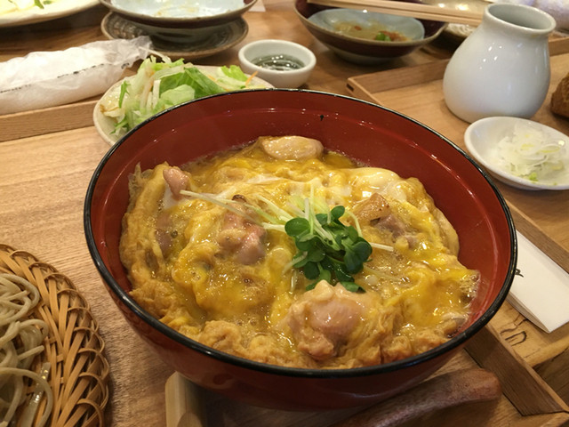 東京軍鶏と卵でふんわりと仕上げました。 軍鶏丼 1450円 ミニ軍鶏丼とそばセット 軍鶏丼合わせ 1400円(昼限定) ミニ軍鶏丼とそばセット 軍鶏御膳 1950円(夜限定) *蕎麦豆腐、軍鶏手羽先の旨煮、デザート付き。
