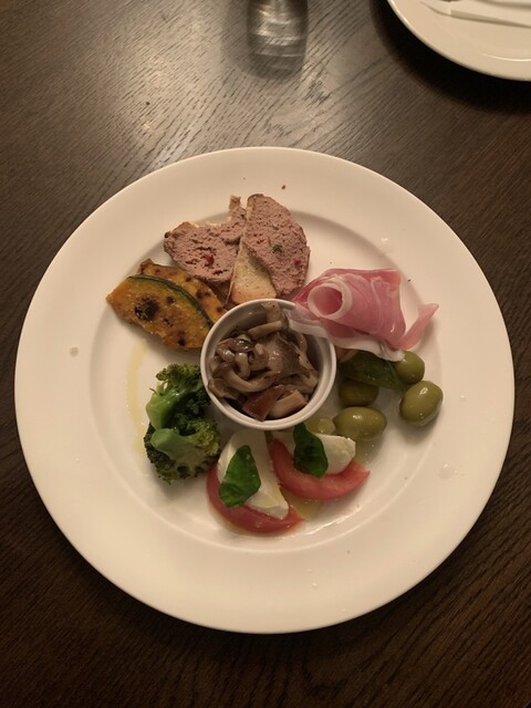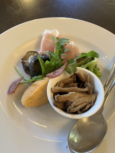 前菜は生ハムもサラミも上品な味。シメジのマリネは...