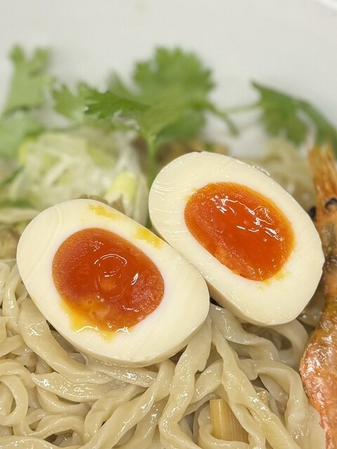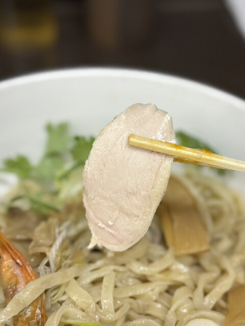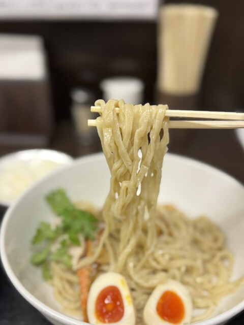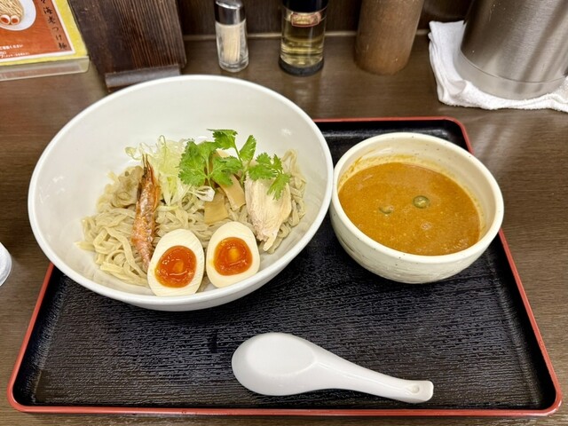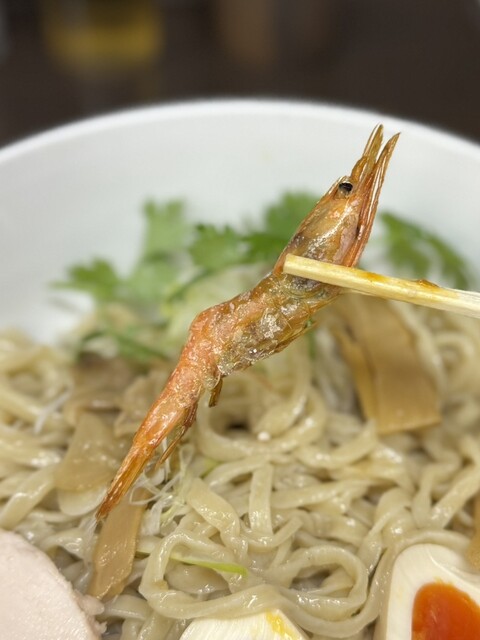 濃厚なつけ汁は、香ばしい海老の風味の奥にコクのある胡麻の風味。旨味先行...