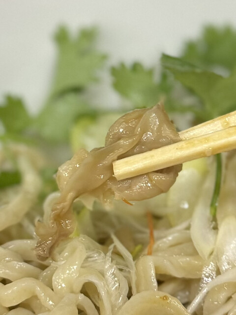 大きめの丼に盛り付けられた自家製麺は平打ちの太麺でツルモチ食感。