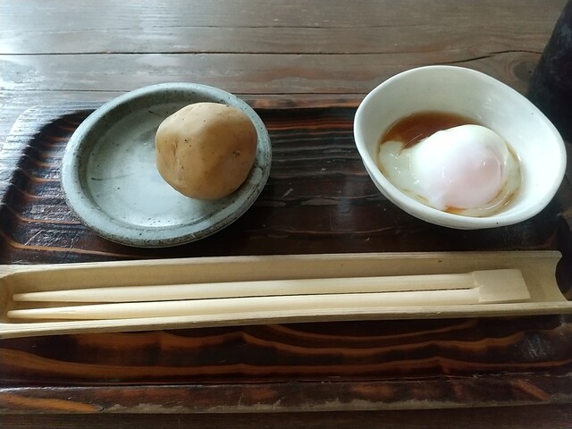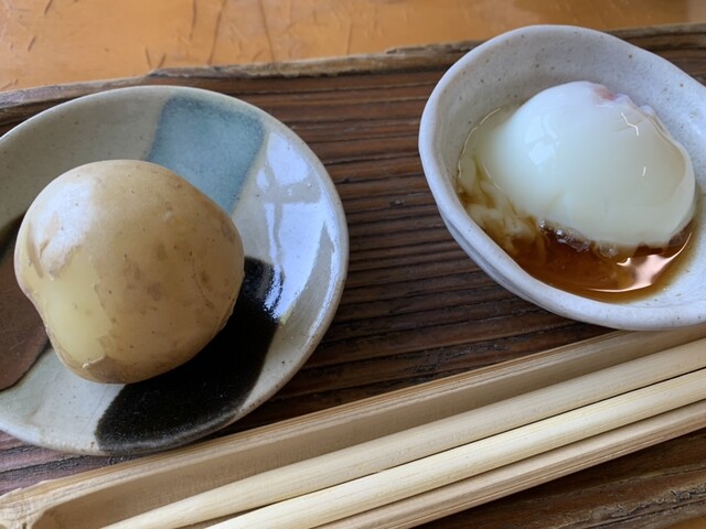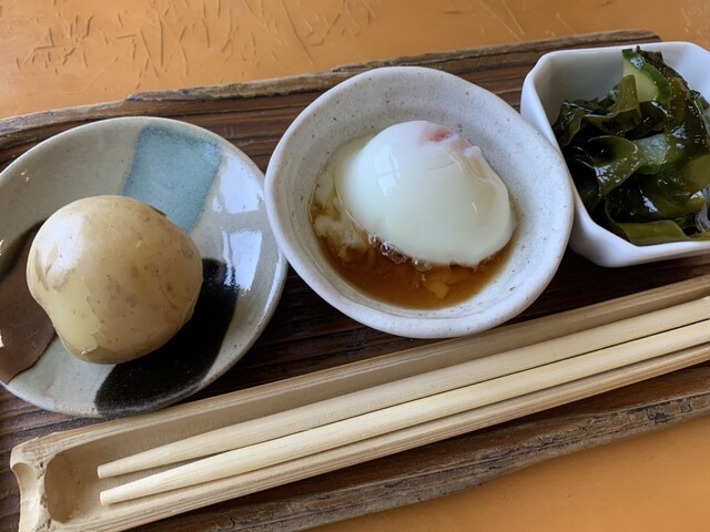 注文すると直ぐに先付けの蒸したジャガイモと温泉卵が出て来て何方も最低限の味付けで美味しかったです。