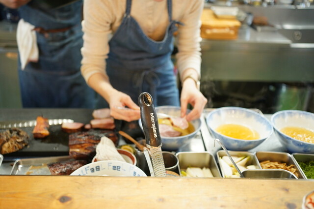 ひと口ごとに味が深まる──それが「Ramen FeeL」のラーメンだ。醤油・塩・つけ麺に合わせて計4種の麺を仕込み、麺からほどける小麦の旨みを”味の変化”として計算に組み込むことで、表情が移ろう一杯へと仕立てていく。塩はアサリや貝柱など乾物の出汁で澄んだ輪郭を描き、醤油は7〜8種の本醸造醤油を重ねて奥行きを生む。麺とスープが口の中でひとつに溶け合った瞬間、初めて“FeeLの一杯”は完成する。