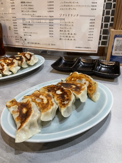 メインの餃子は焼き餃子が肉汁、生姜、エビしその3種類。他にもスープ餃子、揚げ餃子もあります。