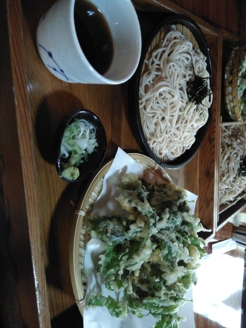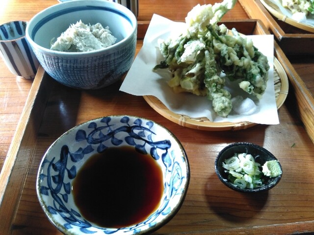 山菜の天ぷらを沢山食べたかったので、山芋の蕎麦単品と、5種天ぷら盛りを注文。