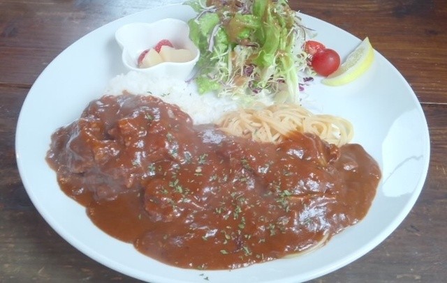 ライスとパスタにデミグラスソースがかかった特製プレートです。