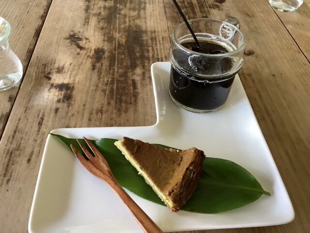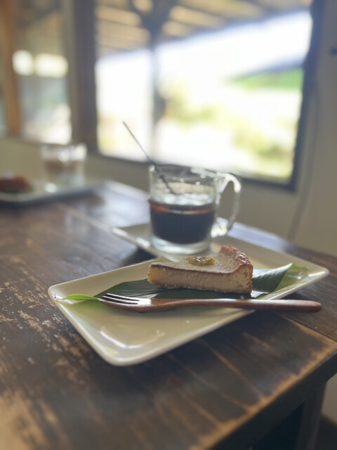 テラス席もあり、展望がいい2階もある。明日葉チーズケーキは、しっとりしていて美味。コーヒーも風味がよく、クセになる味でした。