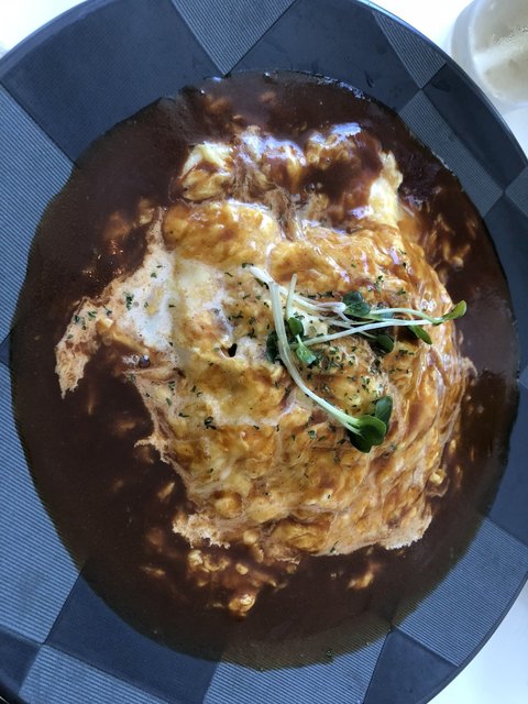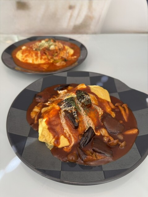 巻き上げタイプのオムライスやけど卵が分厚めでふわふわしてる!おいしい!