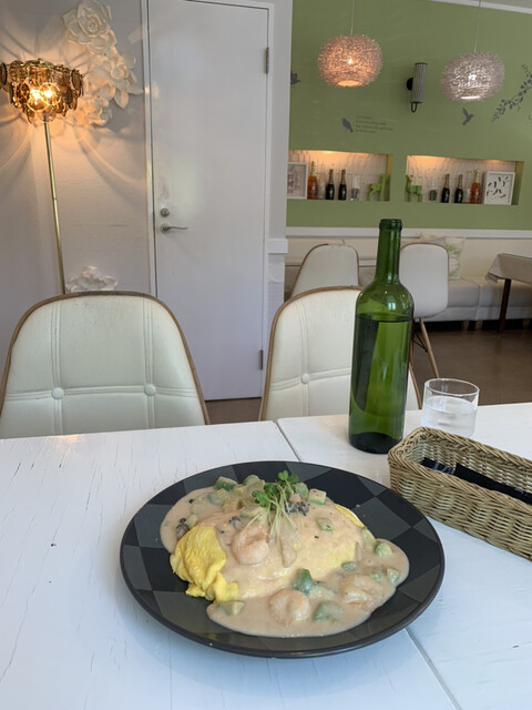 海老ぷりとアボカドと甘い玉ねぎに明太クリーム。見た目も味もナイスなオムライス。