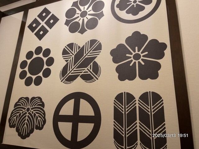 入店し予約した者である旨を伝え個室に導かれる。個室は4人入れるけど、カップルがいちゃつくくらいのスペースのような気がします。壁には戦国武将の家紋があっていいですね。島津です。