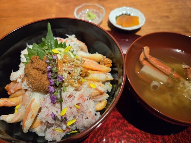 ランチで松葉蟹の香箱蟹丼を頂きました。松葉蟹の季節で蟹自体は美味しく、お米も粒が立っていてとても美味しいのですが、丼にす...
