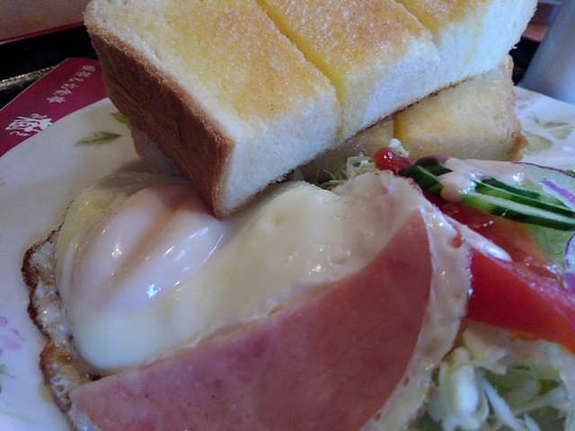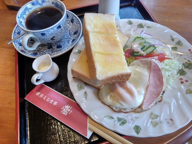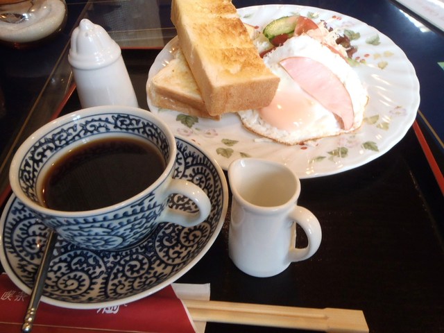 サラダ、ハムエッグ、トースト一枚、コーヒー