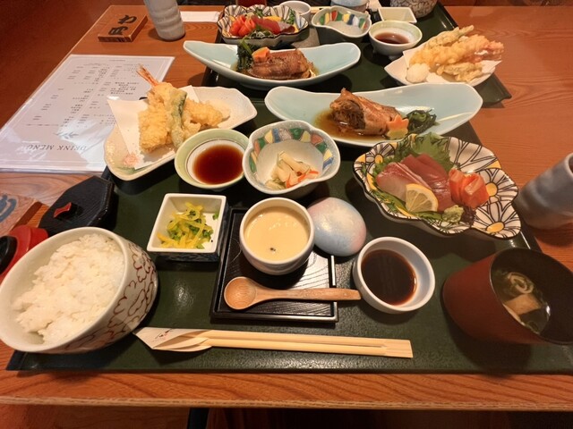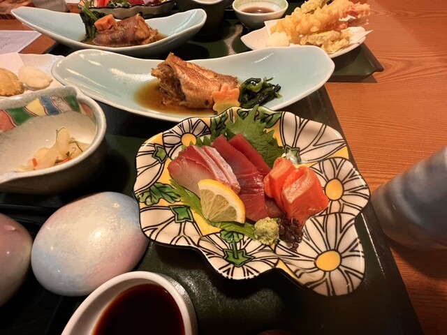 私が頼んだのが「天ぷら刺身御膳(2640円)」です。他のみなさんは、「釜めし定食(1760円)」や「唐揚げおろしポン酢定食(1760円)」や「四季庵御膳・茜(2970円)」や「黒毛和牛ステーキ天ぷら御膳(3630円)」を頼んでおりました。お子様...