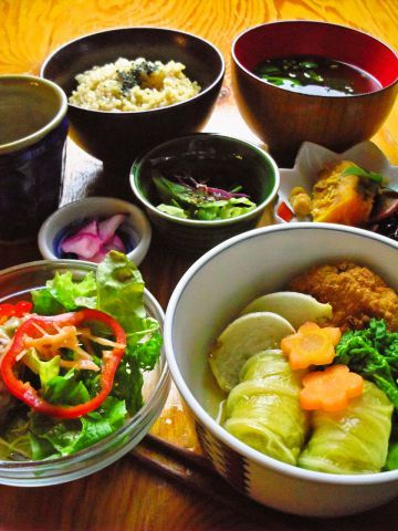 当店では肉、魚、乳製品、卵、白砂糖、化学調味料など一切使用せず 自家栽培の安全な玄米と野菜を中心に 植物性の食材で心を込めて調理し 免疫力を高め体のバランスを整えるキチンとした食事を提案しています。