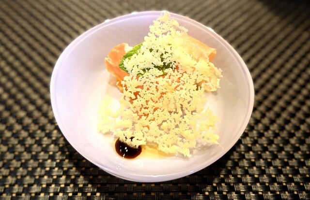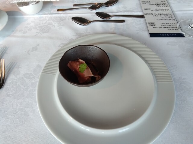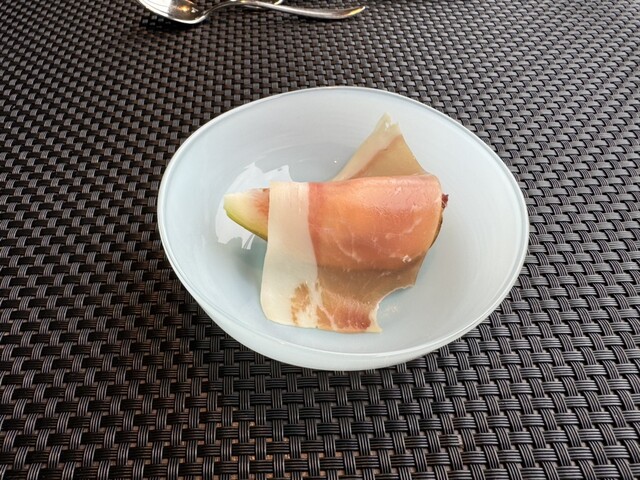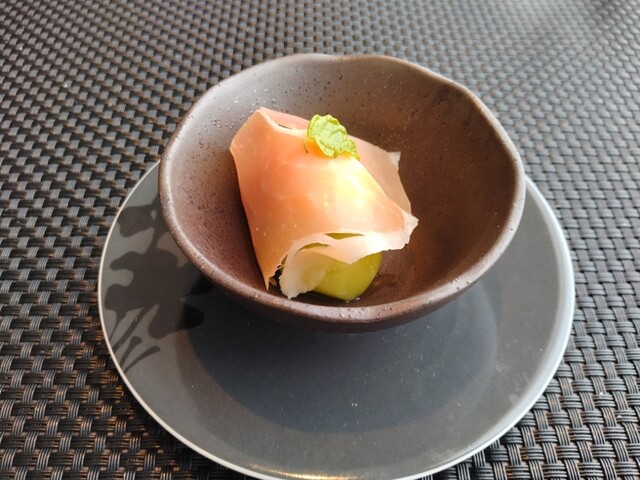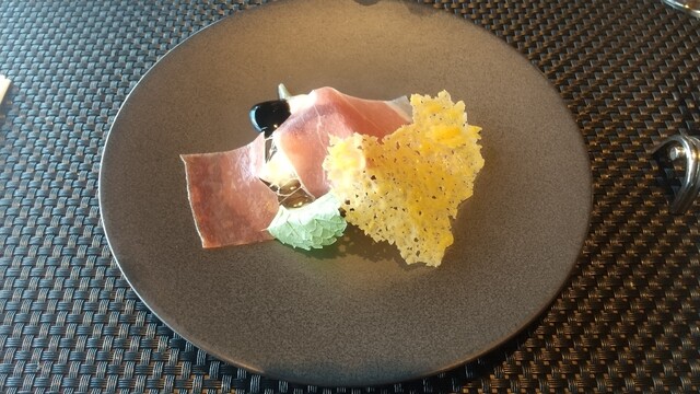 アミューズに生ハム。位置皿、と思ったのですが、その上に置かれます。