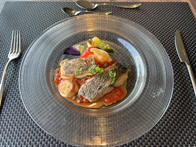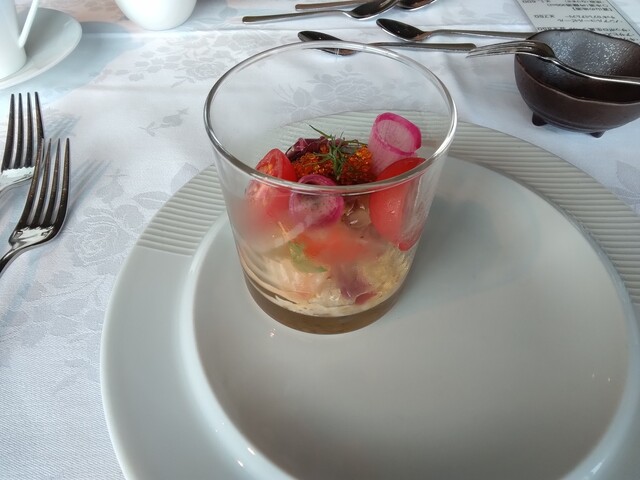 続いてサラダ仕立ての海の幸もその上に。富山産のトマトが美味しい。白海老と昆布の風味のジュレで。結構海鮮が入ってる。