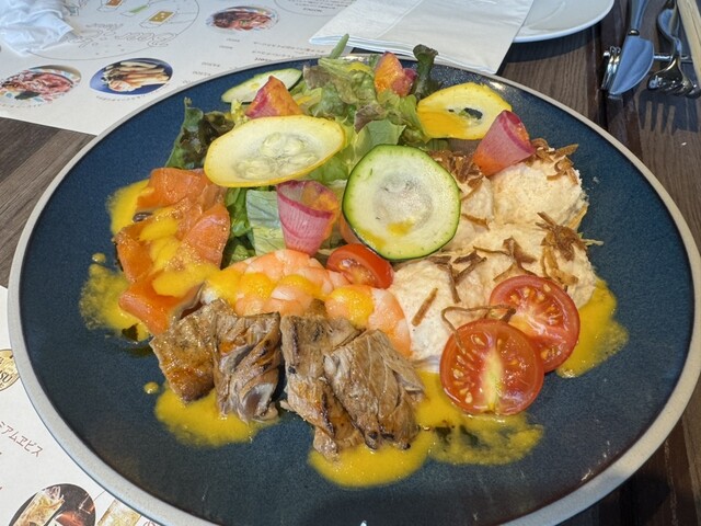 サラダオードブル、メインディッシュ、デザートは2つの中から選択できる。