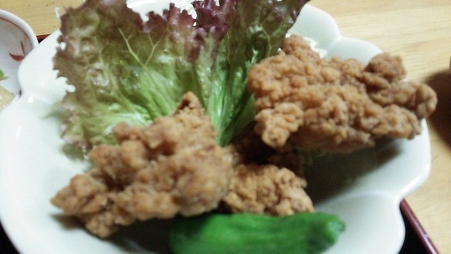 小鉢はエリンギと煮物ときゅうりの酢の物で健康的。唐揚げは3つでまずまずの味。茶飯は出汁で