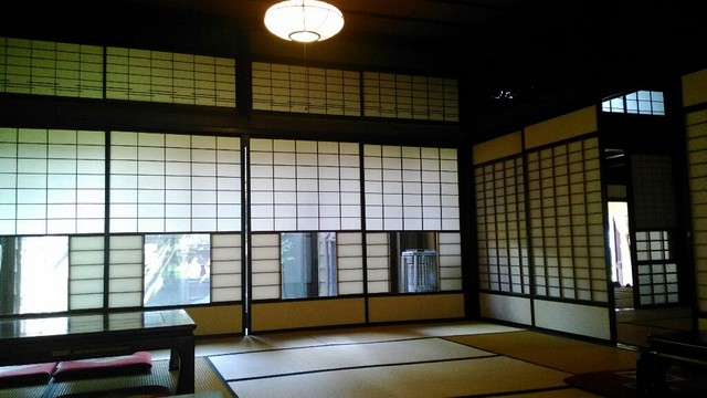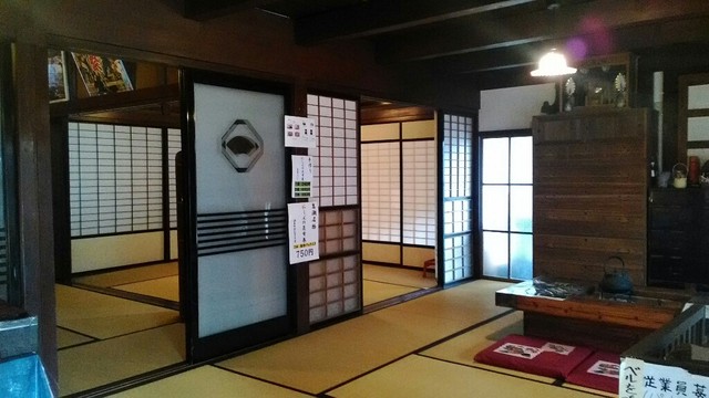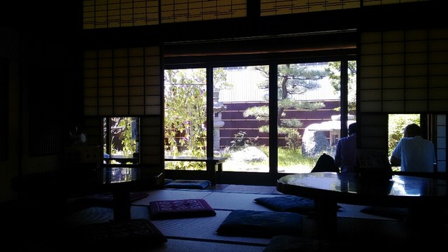 廻船問屋の家を使った食事、喫茶所で、中に入ると昔の家屋そのものです。畳席、テーブル席、庭に面したテーブル席があります。