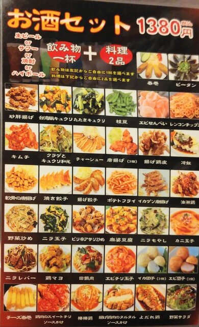 生ビールorサワーor焼酎orハイボールのどれか1杯と料理2品選べるセットです。